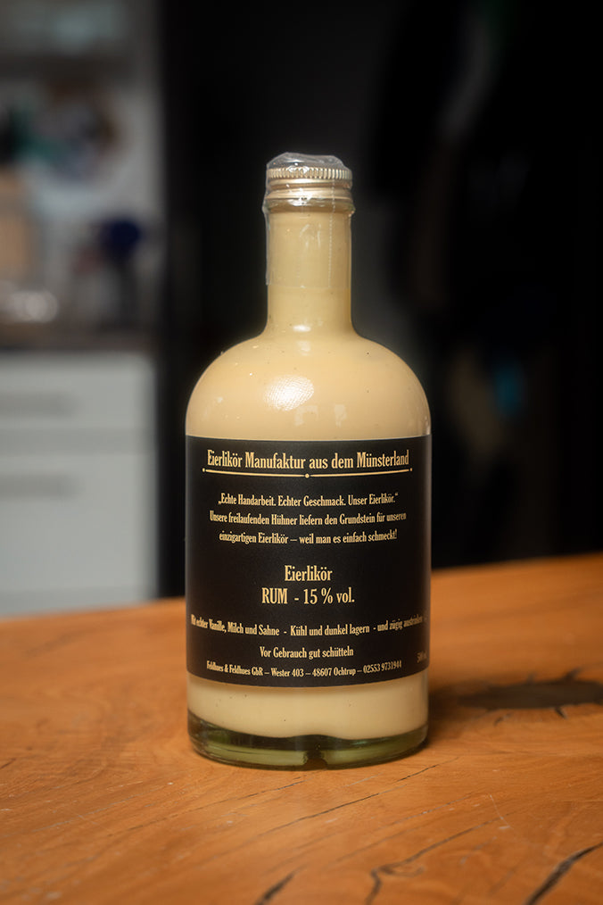 Zutaten: Frische Eier (von unseren eigenen Hühnern), Milch, Sahne, echter Rum, echte Vanille
