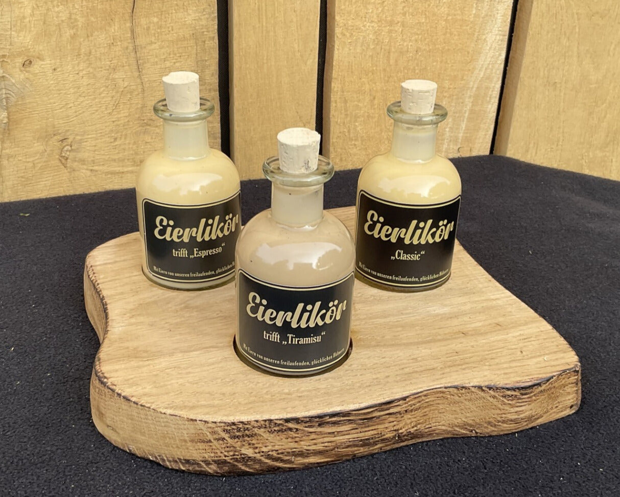 🌿 Eierlikör trifft Eiche – und ein Hauch Nachhaltigkeit Unser Geschenkset vereint Genuss, Handwerk und Stil: 🥚 Drei Sorten hausgemachter Eierlikör auf einem handgefertigten Eichenbrett – jedes Brett ein Unikat. 🍶 Und das Beste: Die Flaschen sind viel zu schön zum Wegwerfen. Nutze sie als Blumenvase, Deko oder für deine eigene Kreation – nachhaltig und stilvoll.