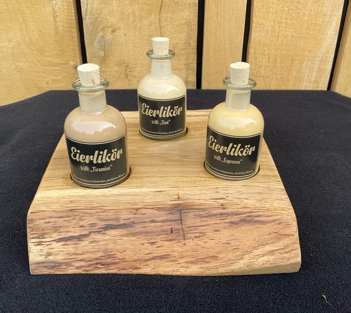 🌿 Eierlikör trifft Eiche – und ein Hauch Nachhaltigkeit Unser Geschenkset vereint Genuss, Handwerk und Stil: 🥚 Drei Sorten hausgemachter Eierlikör auf einem handgefertigten Eichenbrett – jedes Brett ein Unikat. 🍶 Und das Beste: Die Flaschen sind viel zu schön zum Wegwerfen. Nutze sie als Blumenvase, Deko oder für deine eigene Kreation – nachhaltig und stilvoll.