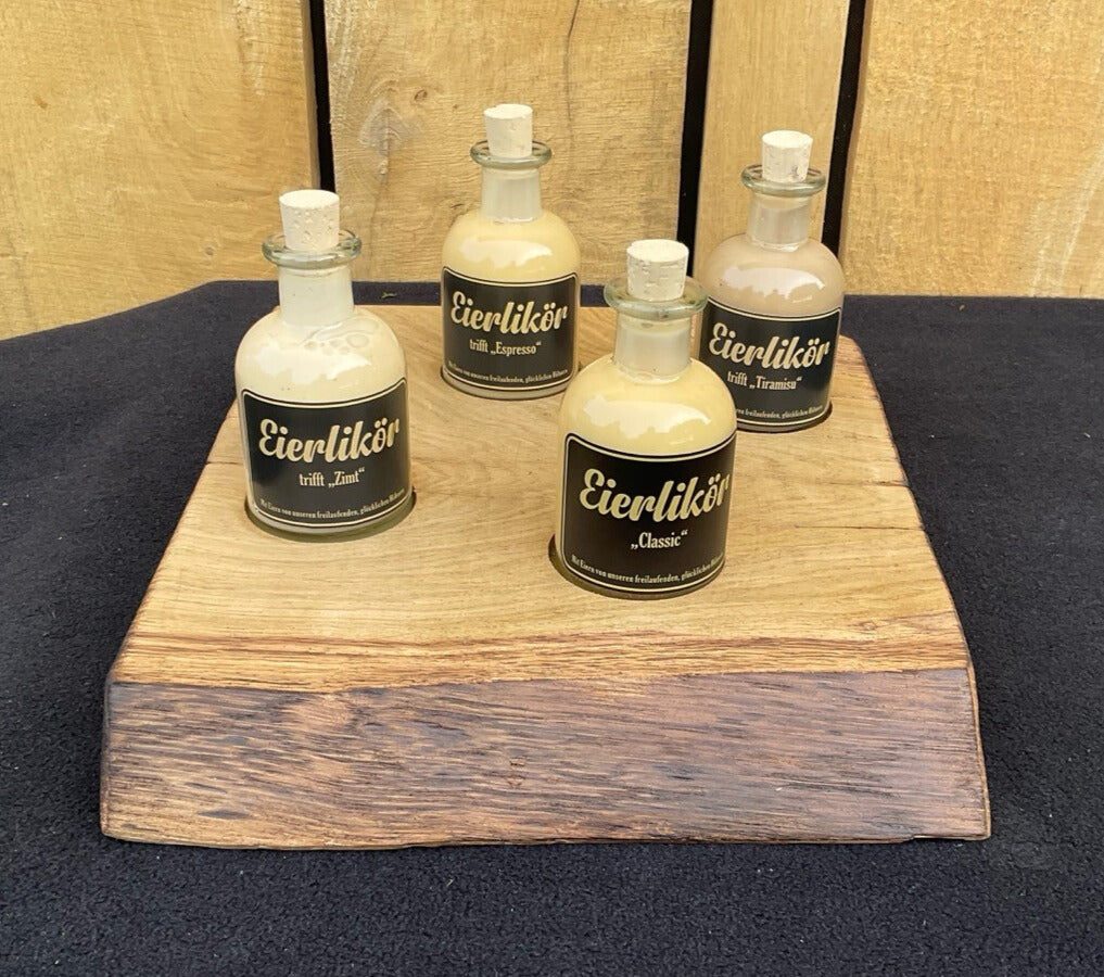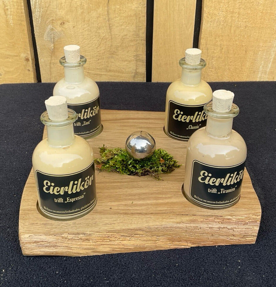 🌿 Eierlikör trifft Eiche – und ein Hauch Nachhaltigkeit Unser Geschenkset vereint Genuss, Handwerk und Stil: 🥚 Drei Sorten hausgemachter Eierlikör auf einem handgefertigten Eichenbrett – jedes Brett ein Unikat. 🍶 Und das Beste: Die Flaschen sind viel zu schön zum Wegwerfen. Nutze sie als Blumenvase, Deko oder für deine eigene Kreation – nachhaltig und stilvoll.