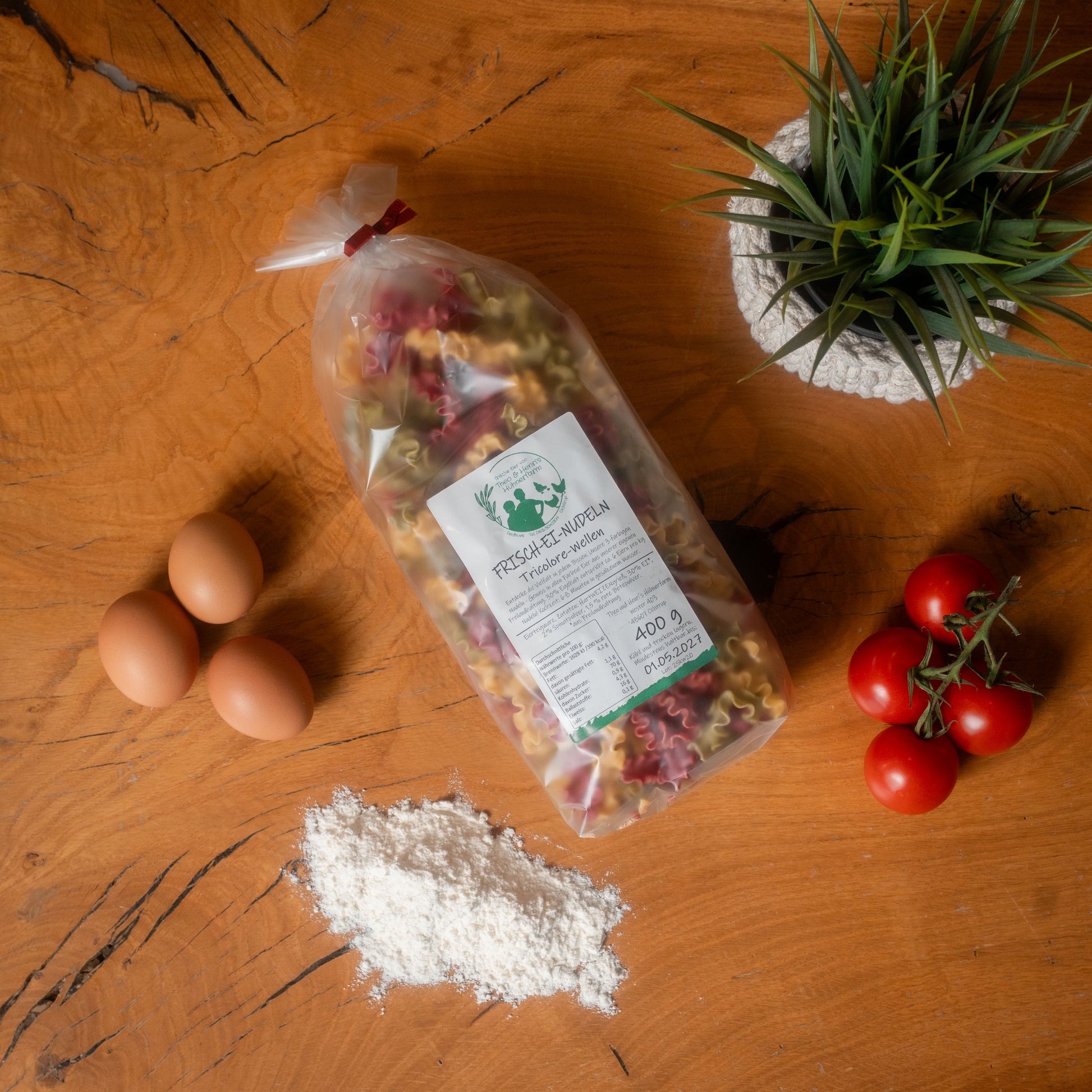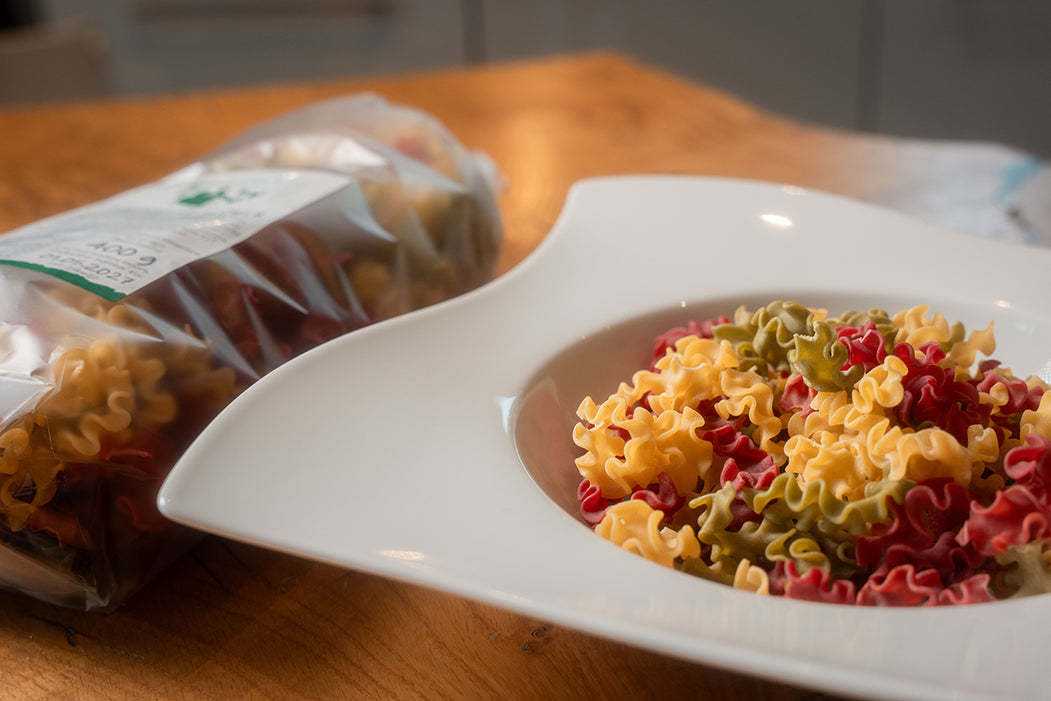 Dreifarbiger Genuss mit echtem Mehrwert: Unsere Frisch-Ei-Nudeln Tricolore sind nicht nur ein optisches Highlight – sie überzeugen vor allem durch ihren außergewöhnlich hohen Ei-Anteil von 30 %. Das bedeutet: mehr Geschmack, mehr Nährstoffe, mehr Qualität. Und das schmeckt man bei jedem Bissen.