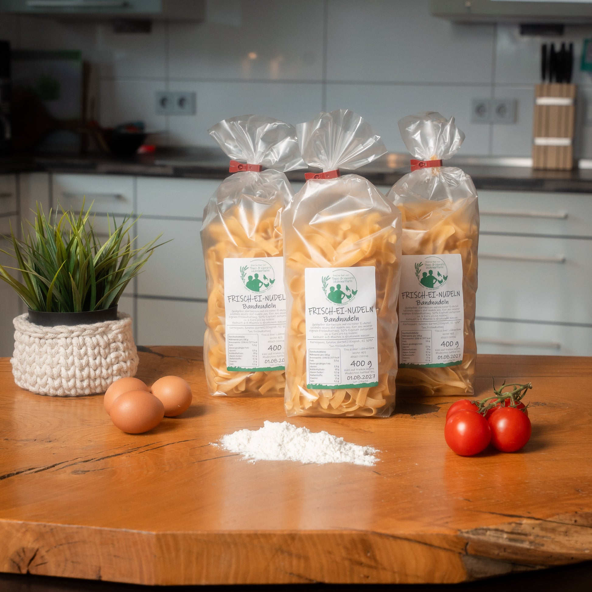 Mehr Ei. Mehr Geschmack. Mehr Heimat. Unsere Frisch-Ei-Bandnudeln sind ein echtes Qualitätsprodukt aus Theo & Henri’s Hühnerfarm – mit stolzen 30 % frischem Ei-Anteil. Das ist mehr als doppelt so viel wie bei handelsüblichen Nudeln und sorgt für einen besonders aromatischen, goldgelben Teig mit perfektem Biss.
